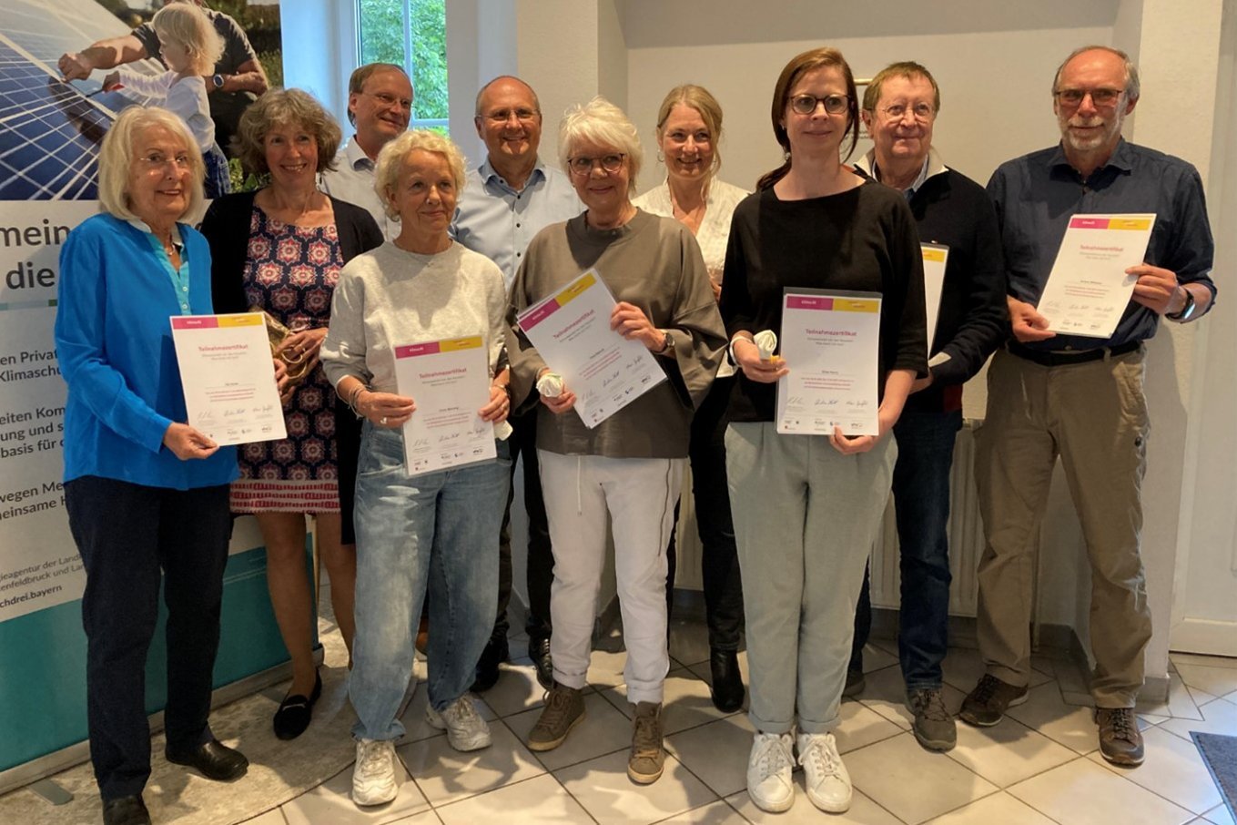 Im vhs-Kurs klima.fit haben sich neun engagierte Bürgerinnen und Bürger gemeinsam mit Josefine Anderer von der KLIMA3-Energieagentur mit den Fragen beschäftigt, was der Klimawandel für sie selbst und ihre Gemeinde und Region bedeutet und was sie aktiv zum Klimaschutz beitragen können. Am letzten Kursabend gratulierte Bürgermeister Christian Schiller und überreichte die Zertifikate für die erfolgreiche Teilnahme. Der vom WWF Deutschland und dem Helmholtz-Forschungsverbund Regionale Klimaveränderungen und Mensch (REKLIM) entwickelte Kurs wurde von der vhs StarnbergAmmersee in Kooperation mit der KLIMA3-Energieagentur durchgeführt.