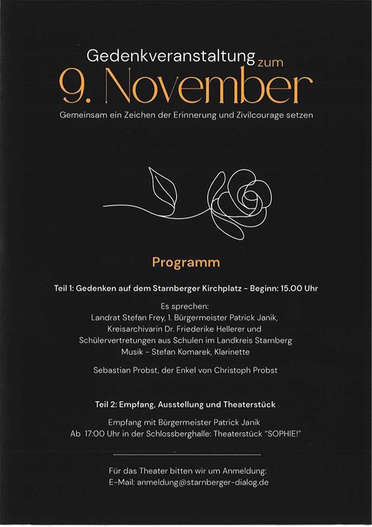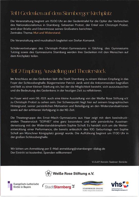 Die Veranstaltung beginnt um 15:00 Uhr mit einer Veranstaltung an der Gedenktafel für die Opfer der Verbrechen des Nationalsozialismus in Starnberg. Neben dem Landrat Stefan Frey und 1. Bürgermeister Patrick Janik wird als Gastredner Sebastian Probst zu den Anwesenden sprechen. Sebastian Probst, der Enkel von Christoph Probst, wird über Briefe und Erkenntnisse seines Großvaters berichten. Außerdem stellt Kreisarchivarin Friederike Hellerer zwei Biographien von Persönlichkeiten aus dem Landkreis vor.